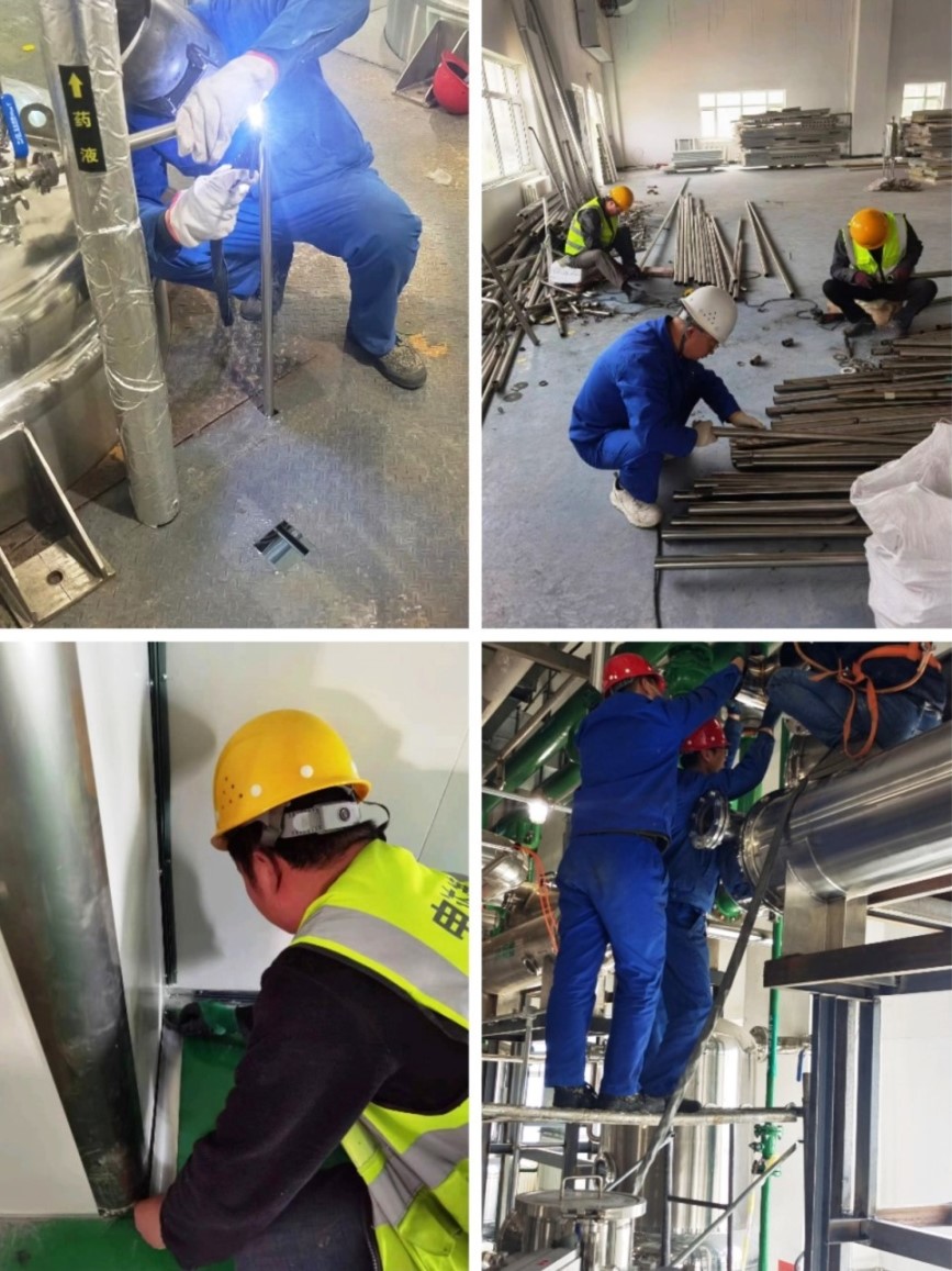 公司党委书记、董事长宋敏平每日深入改造一线,实地查看项目进度,详细了解项目改造时间节点和施工安全保障措施等情况,与项目相关人员就项目推进事宜进行深入交流,并为放弃休假、坚守项目现场的人员送上节日的问候,对他们在假期期间抢工期、抓进度表示感谢。提取车间项目改造人员与车间员工一同加班加点加油干,力争在节假日完成管道保温及项目收尾工作;污水改造项目设备、材料及人员进场;合剂车间施工人员各司其职、有条不紊、相互协作,对现场各工种做好安全技术交底,提前规划现场施工平面图,对支架布置、设备安装及焊接质量严格把控,以高质量、高标准全面推进项目施工按照既定计划完成。