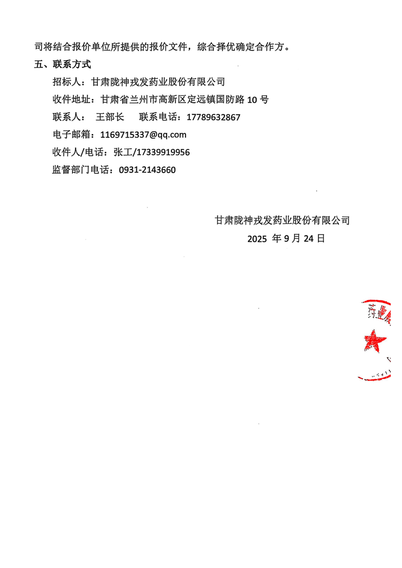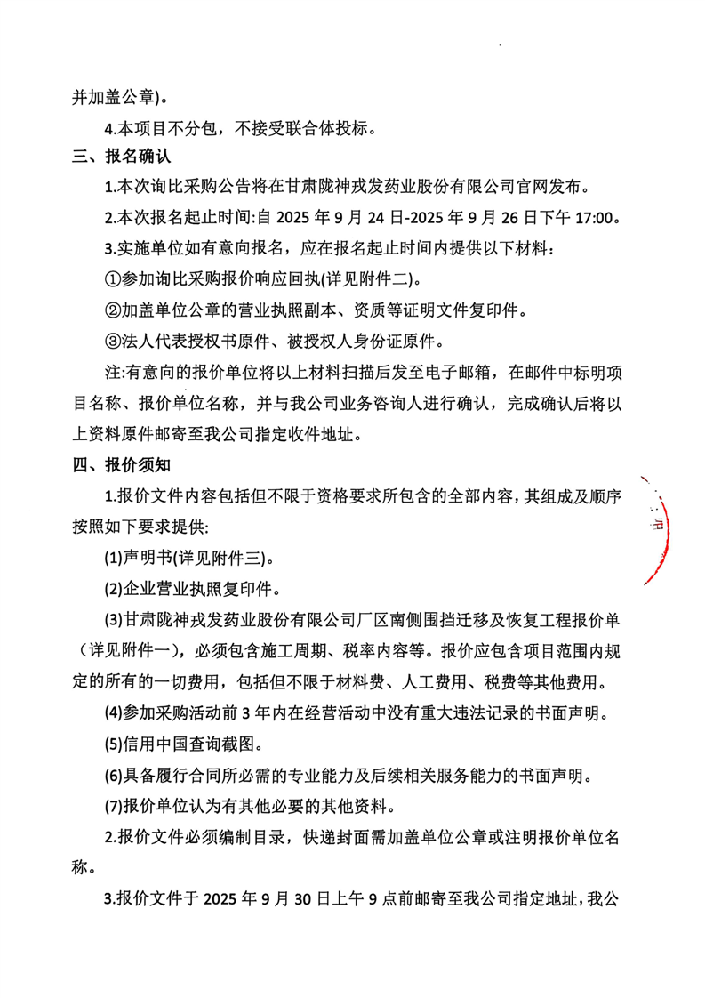 甘肃陇神戎发药业股份有限公司厂区南侧围挡迁移及恢复工程询比采购公告