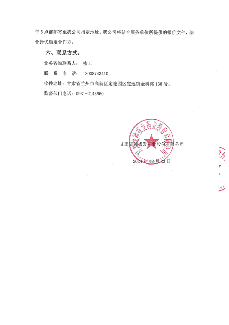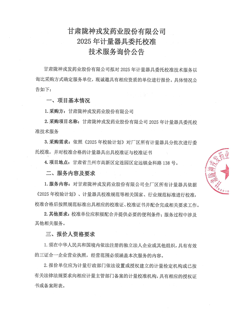 甘肃陇神戎发药业股份有限公司2025年计量器具委托校准技术服务询价公告