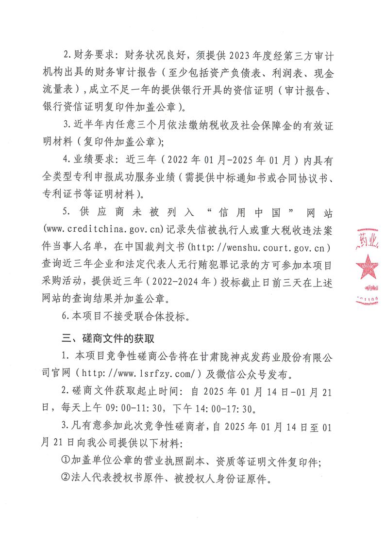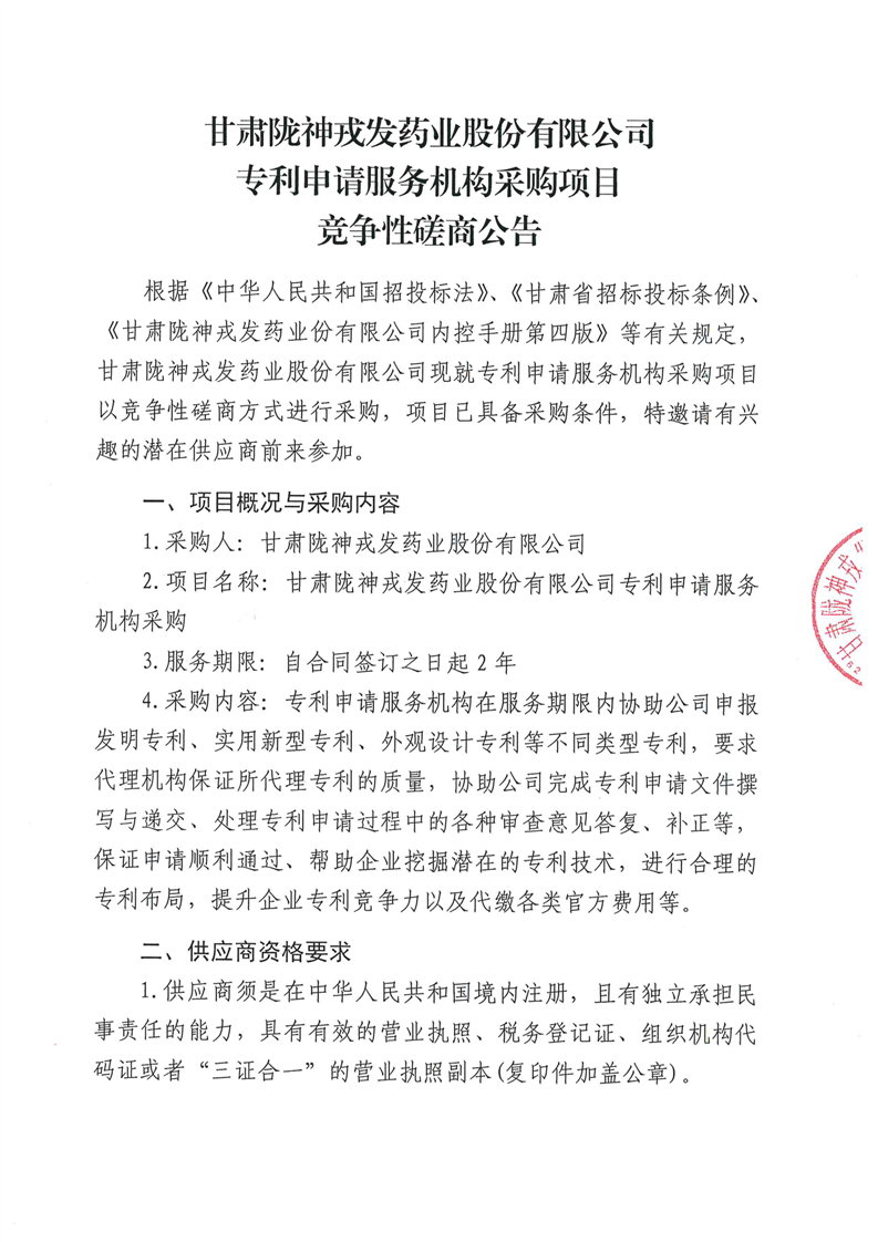 甘肃陇神戎发药业股份有限公司专利申请服务机构采购项目竞争性磋商公告