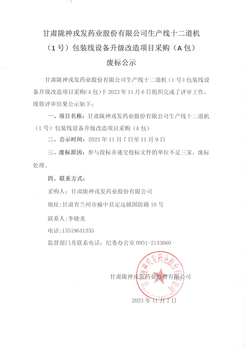 甘肃陇神戎发药业股份有限公司生产线十二道机(1号)包装线设备升级改造项目采购(A包)废标公示