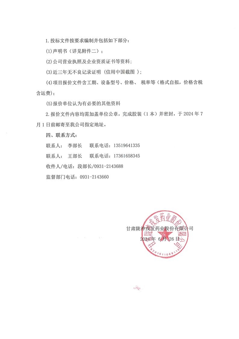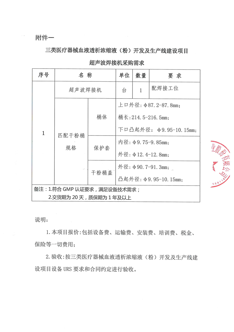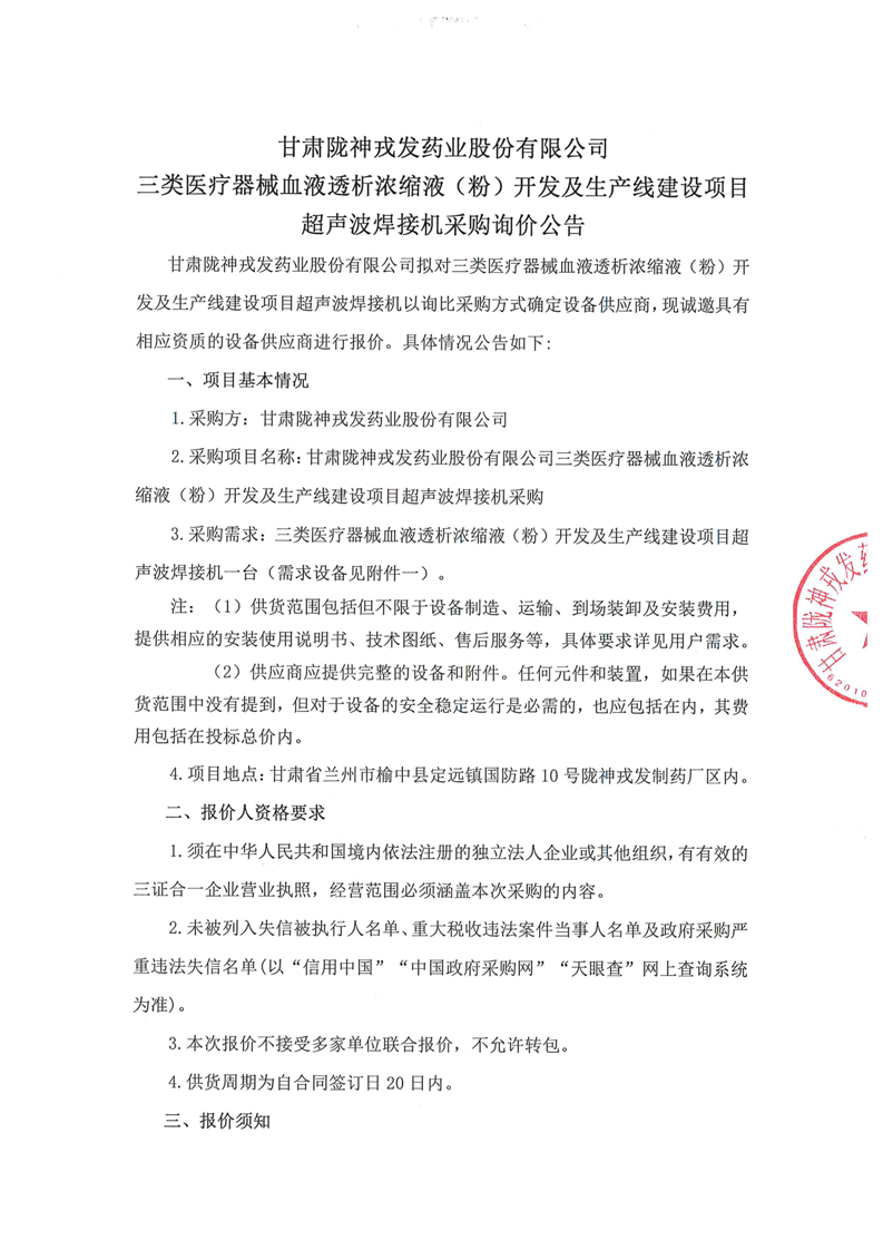 甘肃陇神戎发药业股份有限公司三类医疗器械血液透析浓缩液(粉)开发及生产线建设项目超声波焊接机采购询价公告