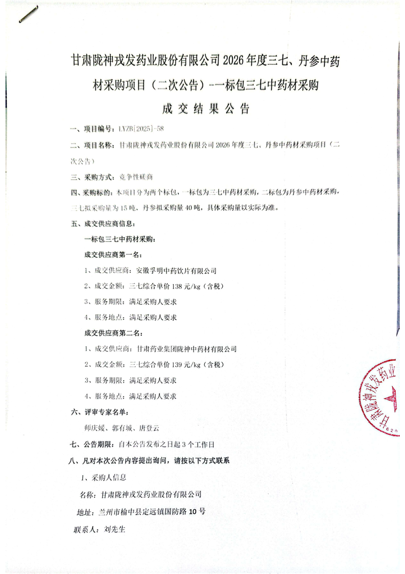 甘肃陇神戎发药业股份有限公司2026年度三七、丹参中药材采购项目(二次公告) 一标包三七中药材采购 成交结果公告