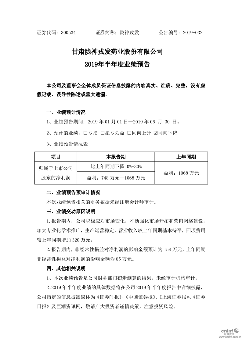 2019年半年度业绩预告