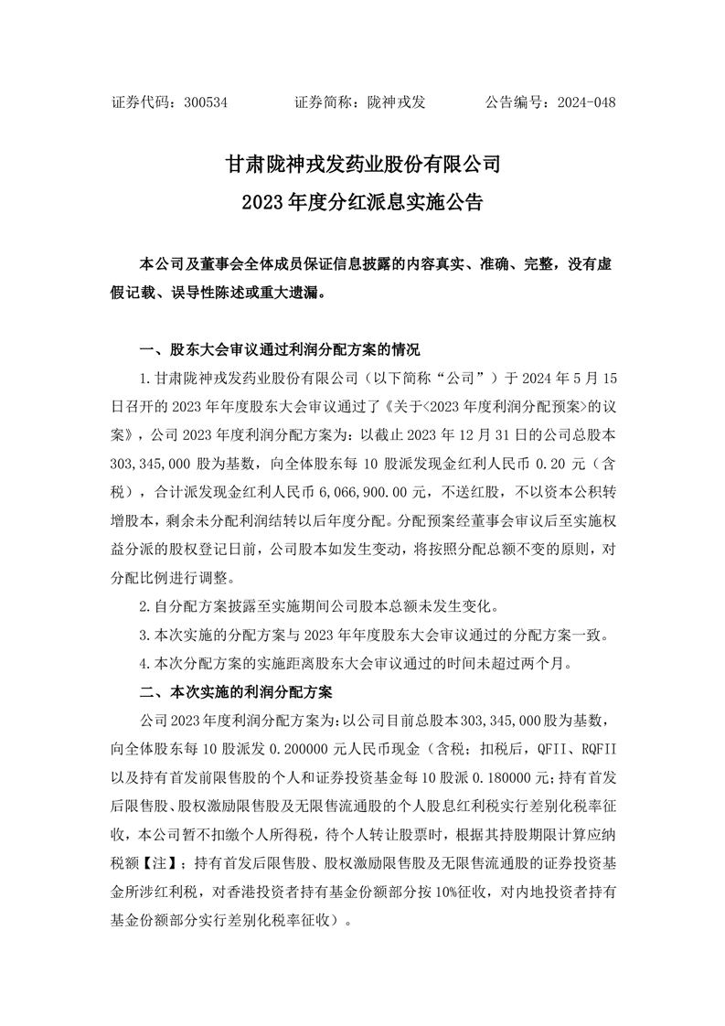 2023年度分红派息实施公告