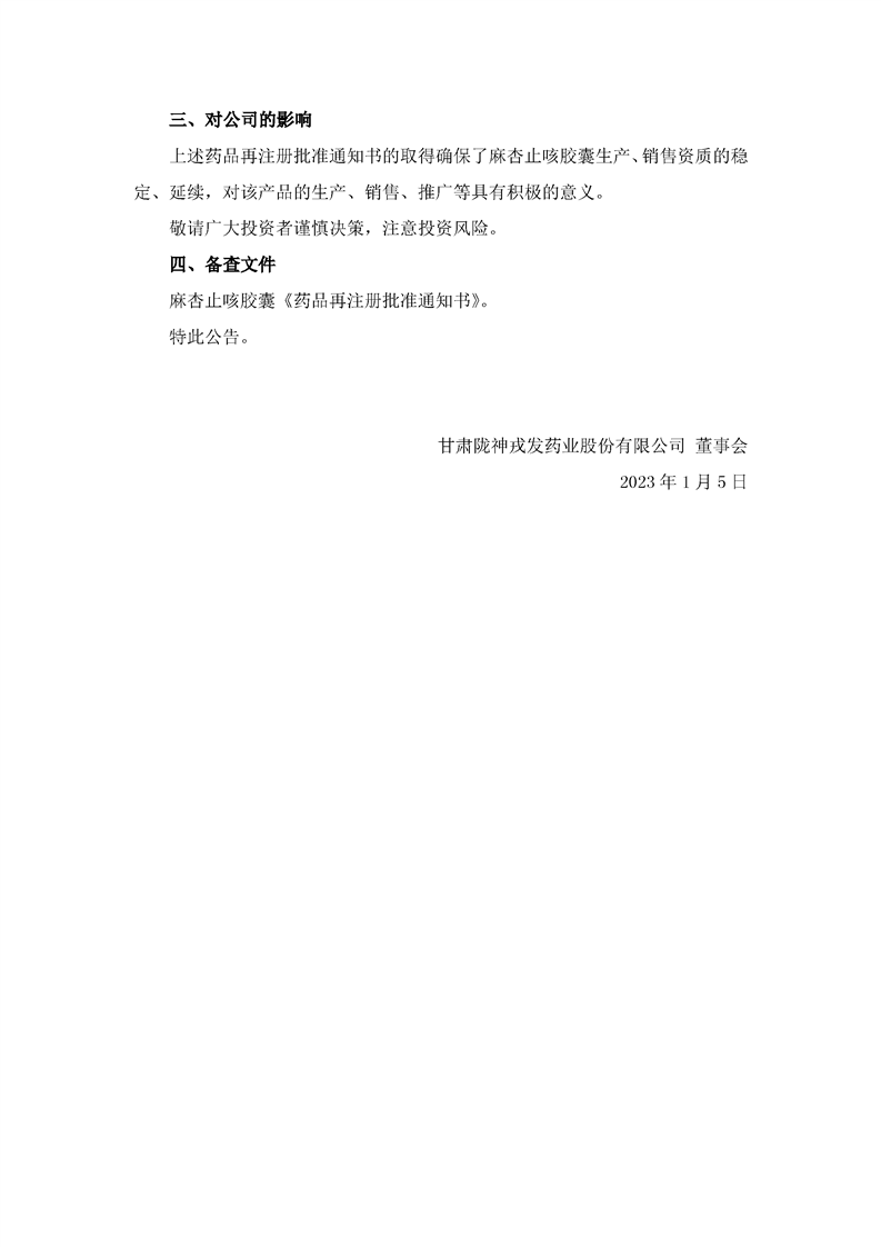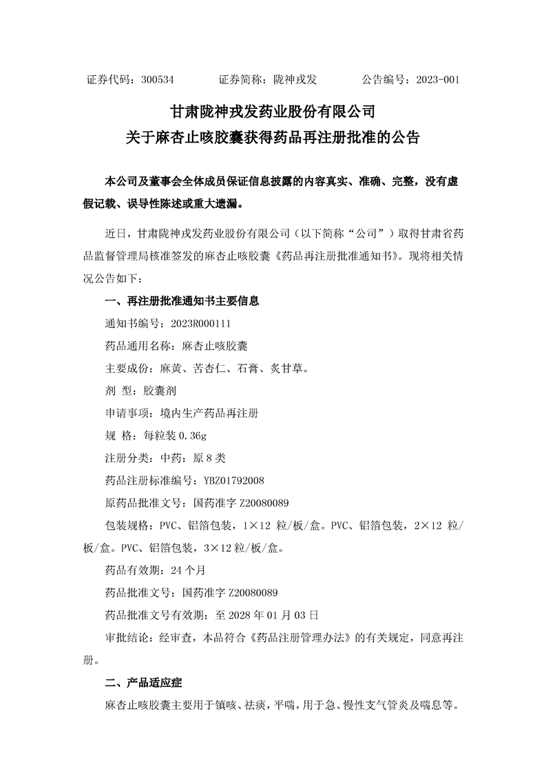 关于麻杏止咳胶囊获得药品再注册批准的公告