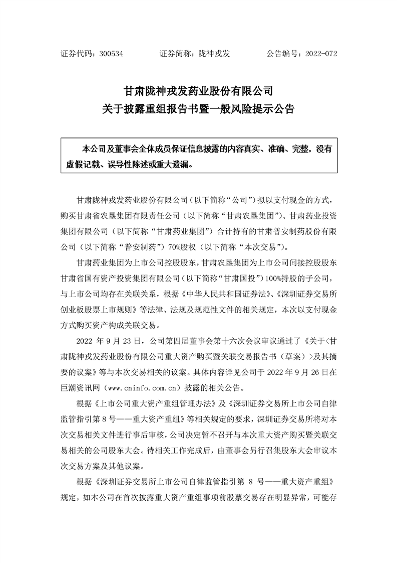 关于披露重组报告书暨一般风险提示公告