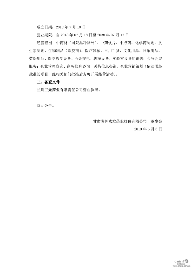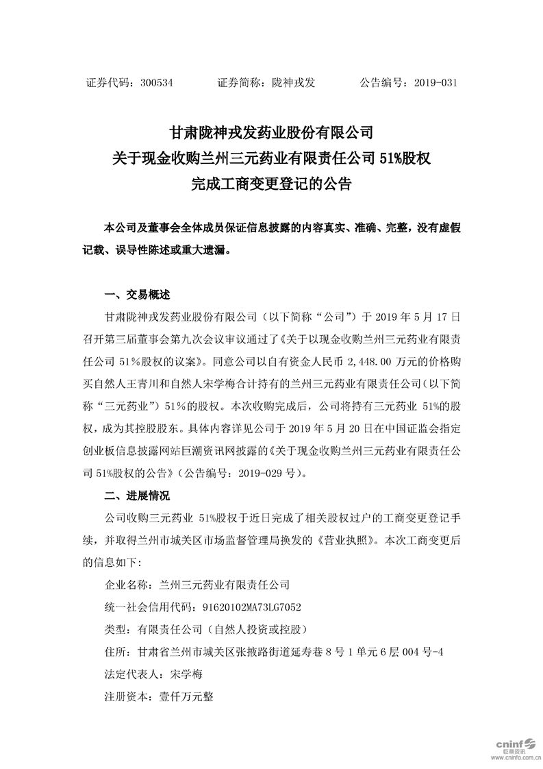 关于现金收购兰州三元药业有限责任公司51%股权完成工商变更登记的公告