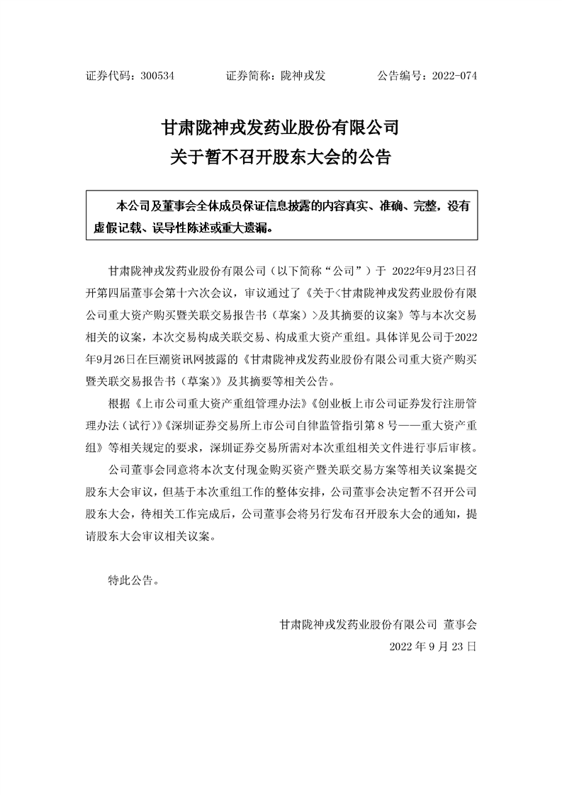 关于暂不召开股东大会的公告