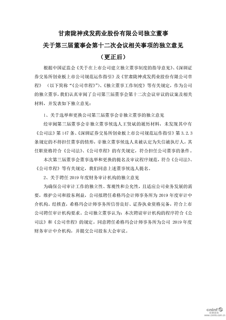 独立董事关于第三届董事会第十二次会议相关事项的独立意见(更新后)