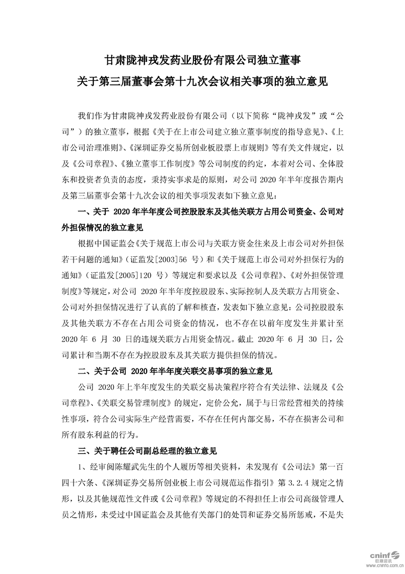 独立董事关于第三届董事会第十九次会议相关事项的独立意见