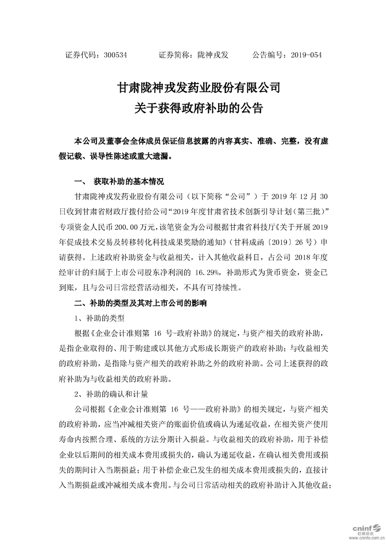 关于获得政府补助的公告