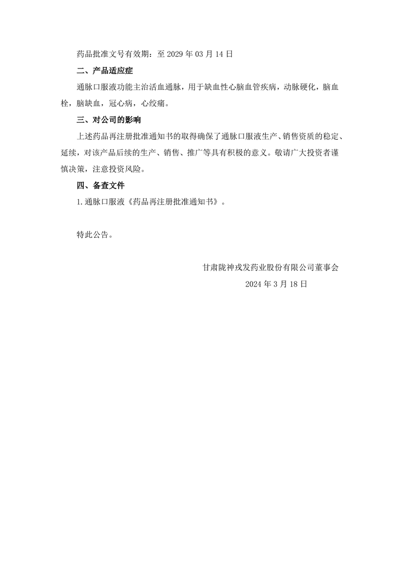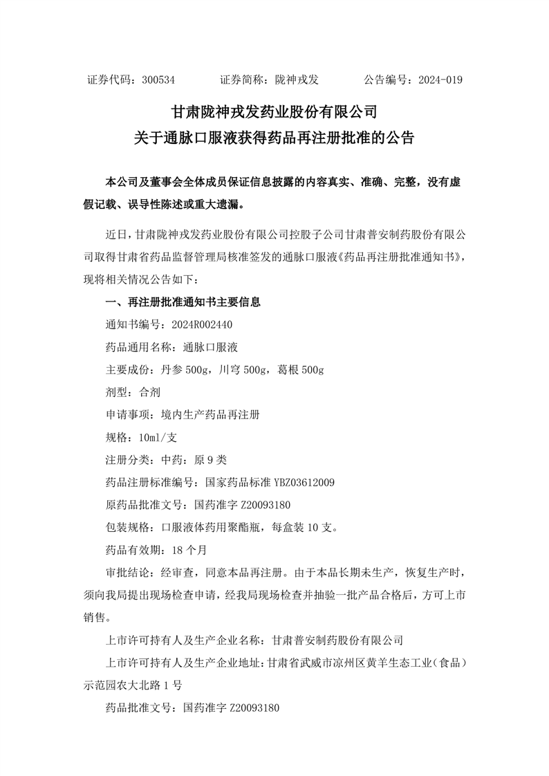 关于通脉口服液获得药品再注册批准的公告
