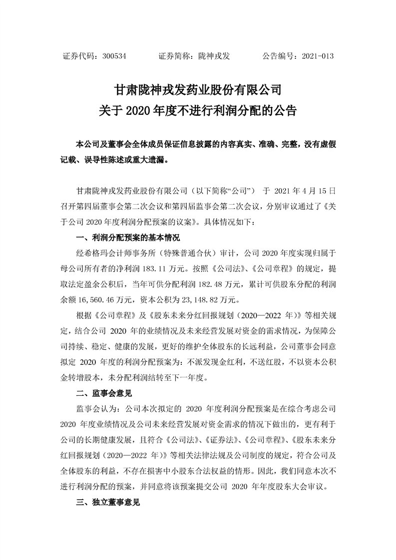 关于2020年度不进行利润分配的公告