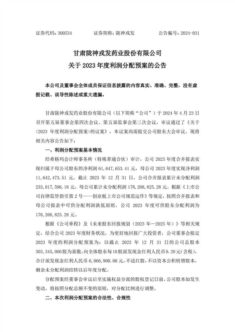 关于2023年度利润分配预案的公告