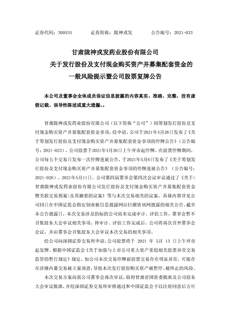 关于发行股份及支付现金购买资产并募集配套资金的一般风险提示暨公司股票复牌公告