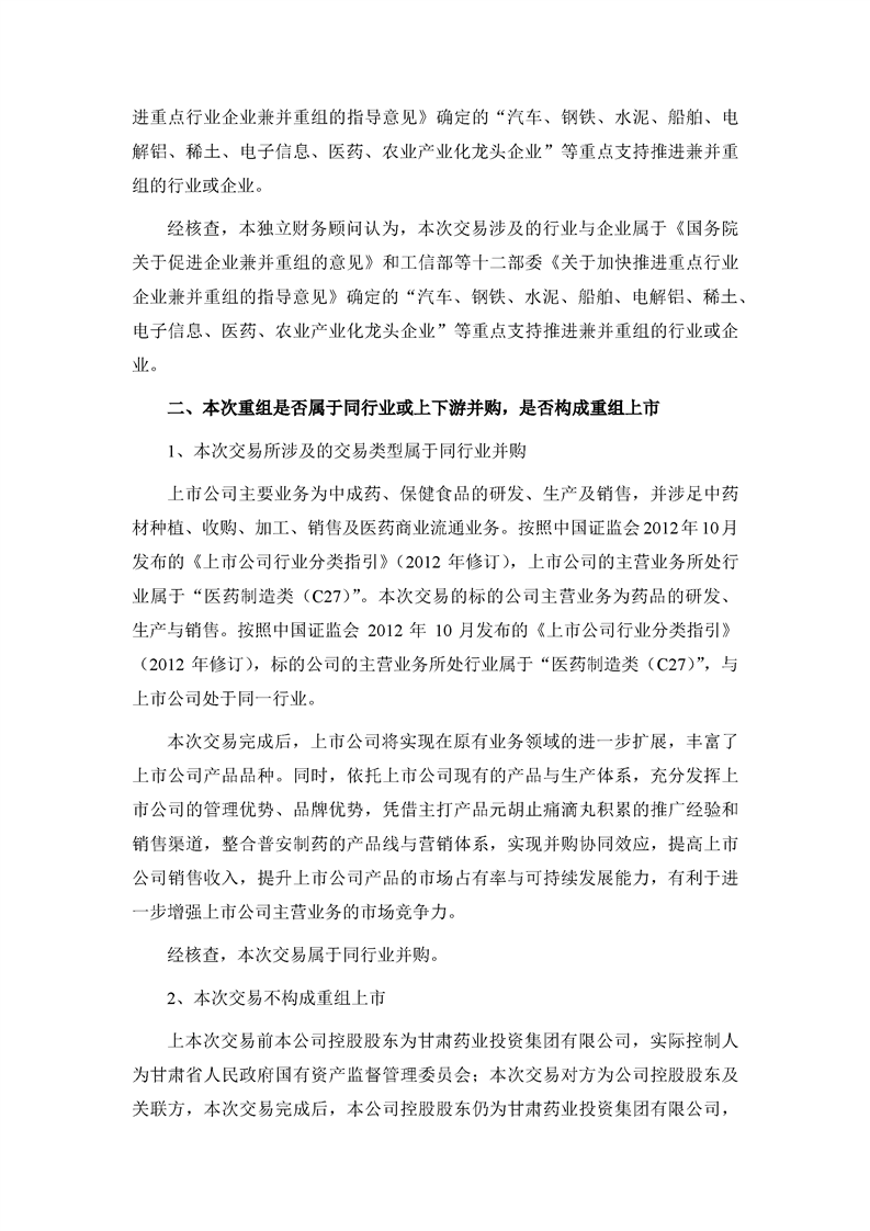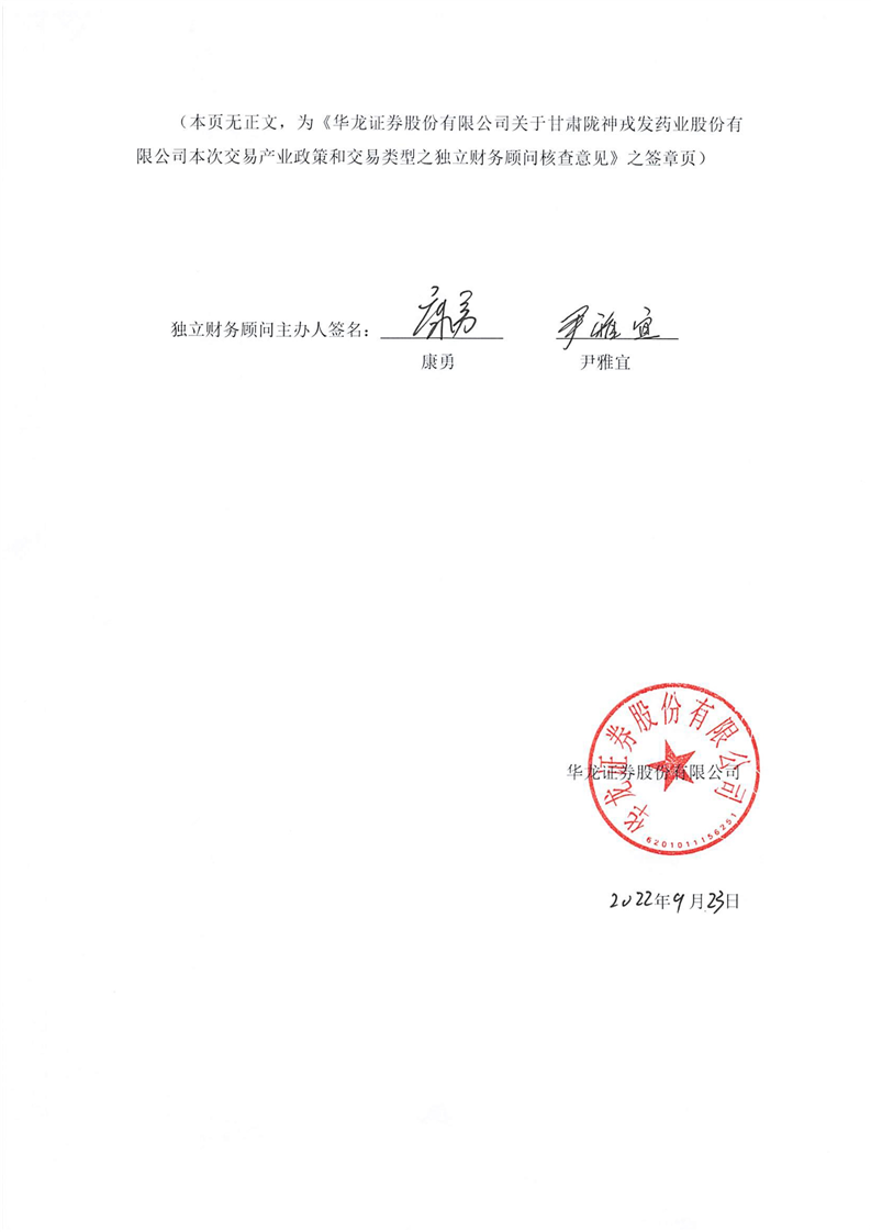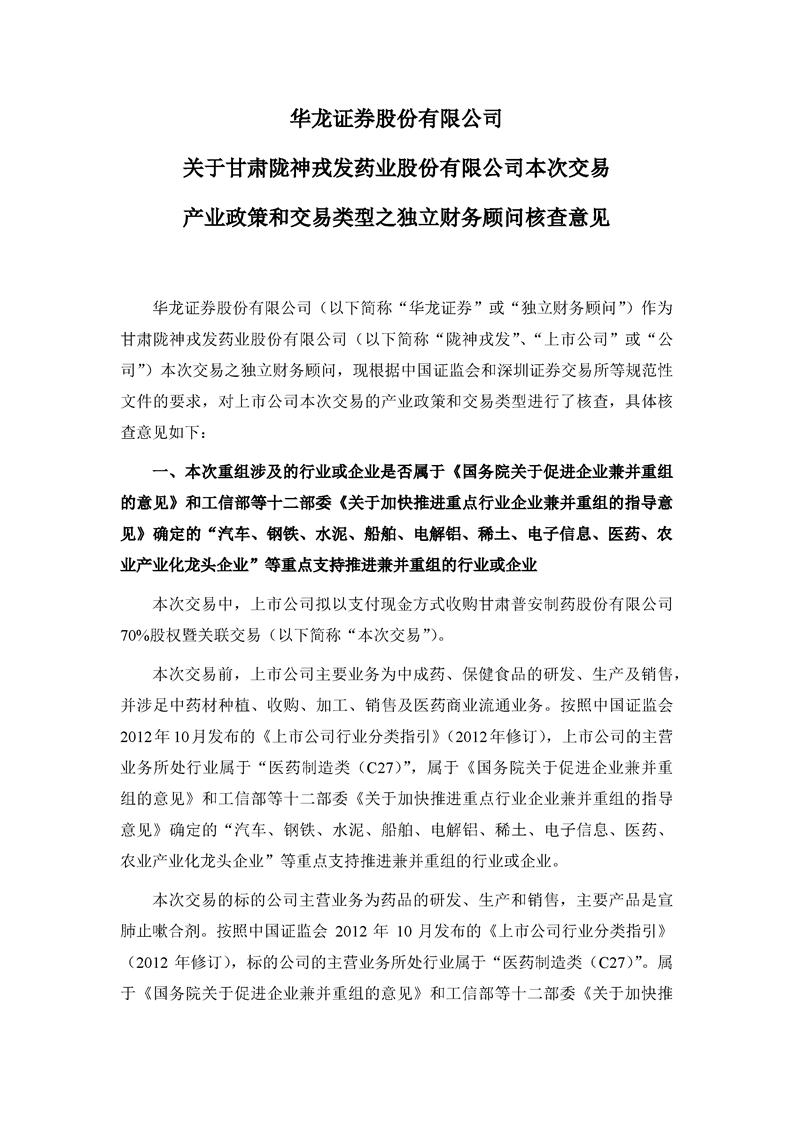 华龙证券股份有限公司关于甘肃陇神戎发药业股份有限公司本次交易产业政策和交易类型之独立财务顾问核查意见