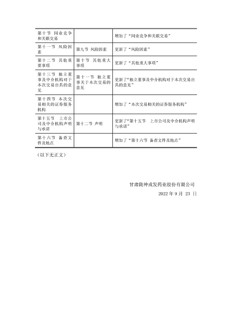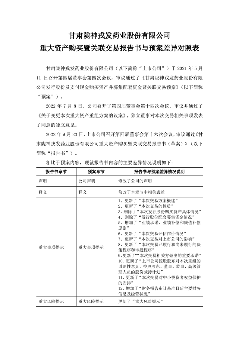 甘肃陇神戎发药业股份有限公司重大资产购买暨关联交易报告书与预案差异对照表