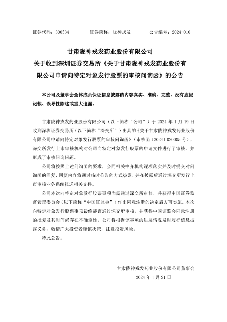 关于收到深圳证券交易所《关于甘肃陇神戎发药业股份有限公司申请向特定对象发行股票的审核问询函》的公告