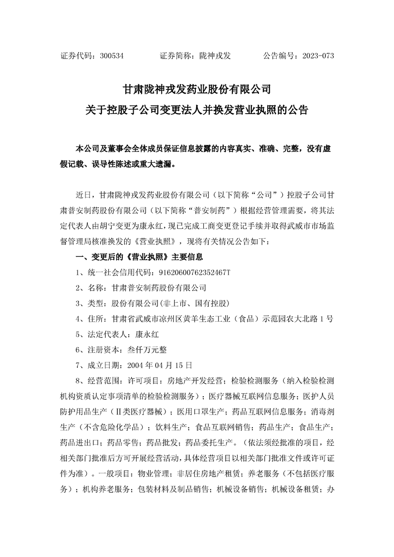 关于控股子公司变更法人并换发营业执照的公告
