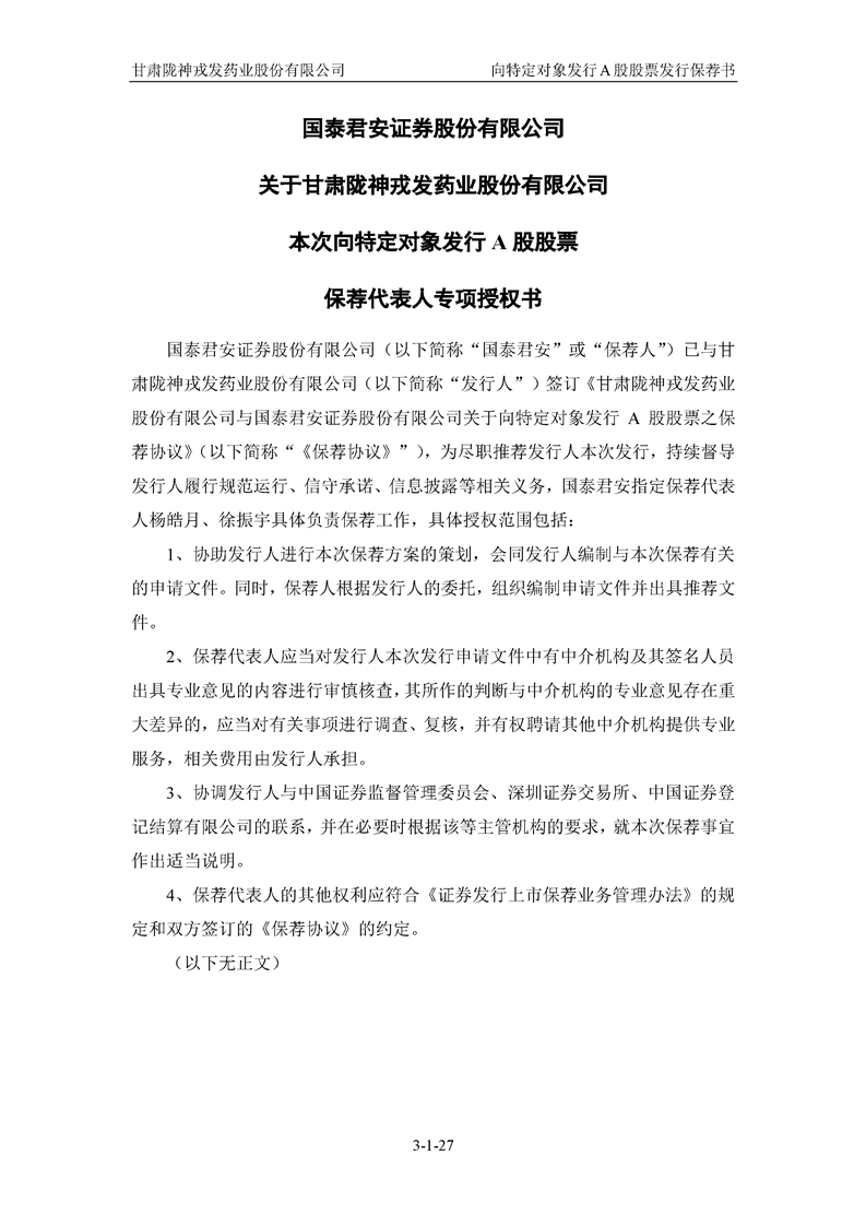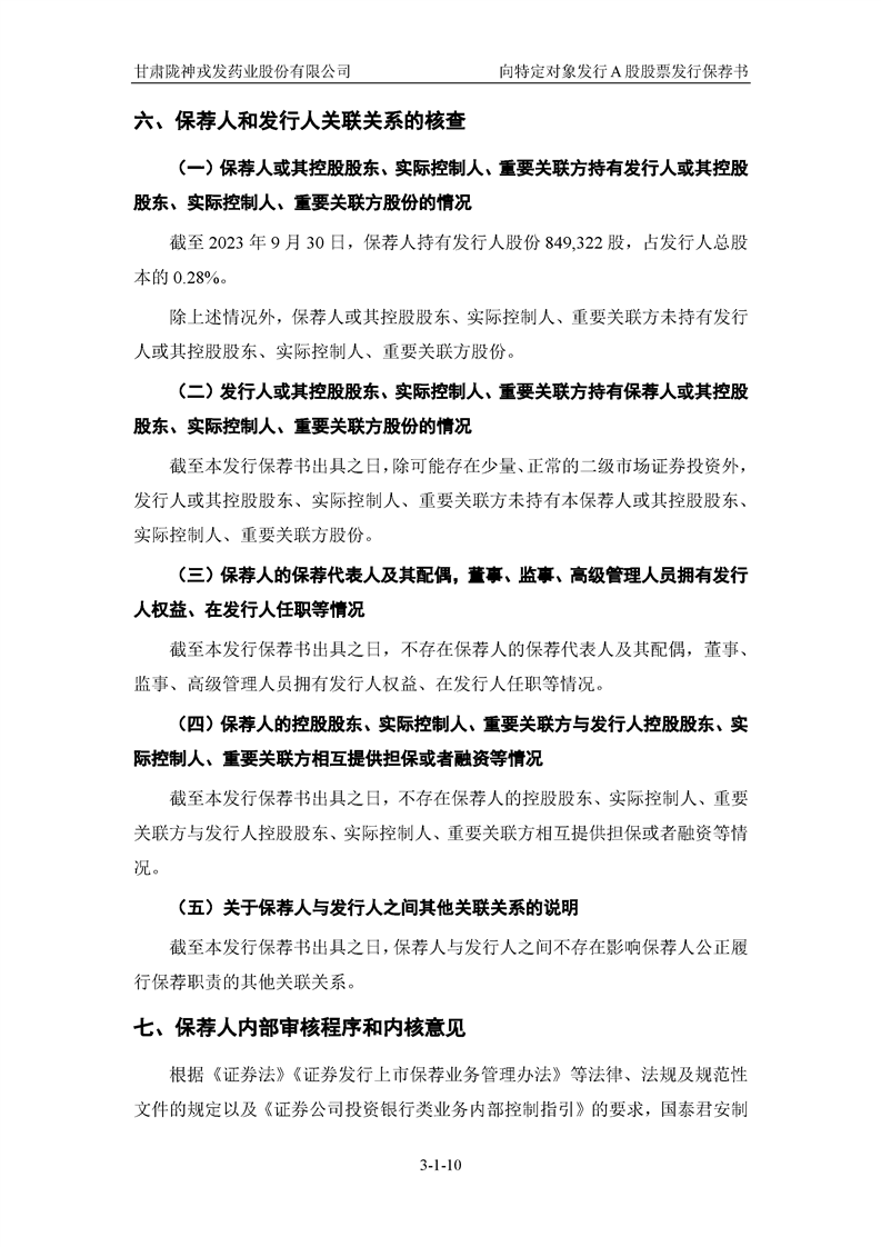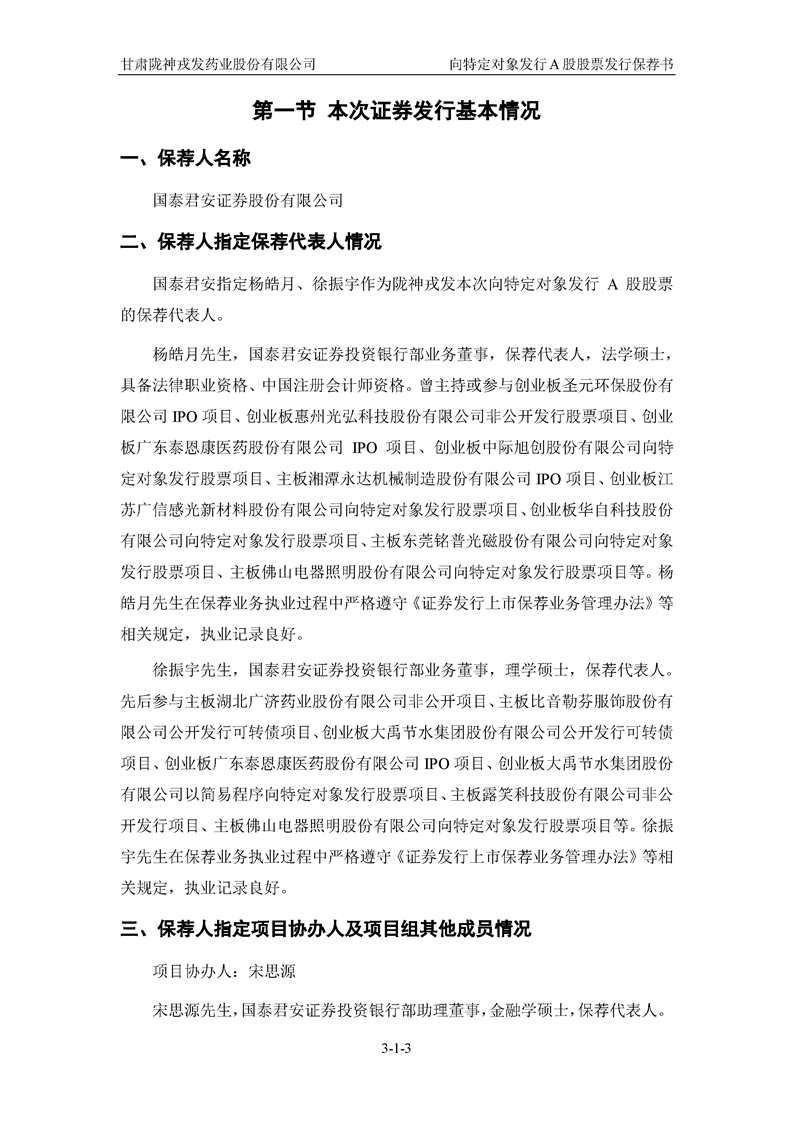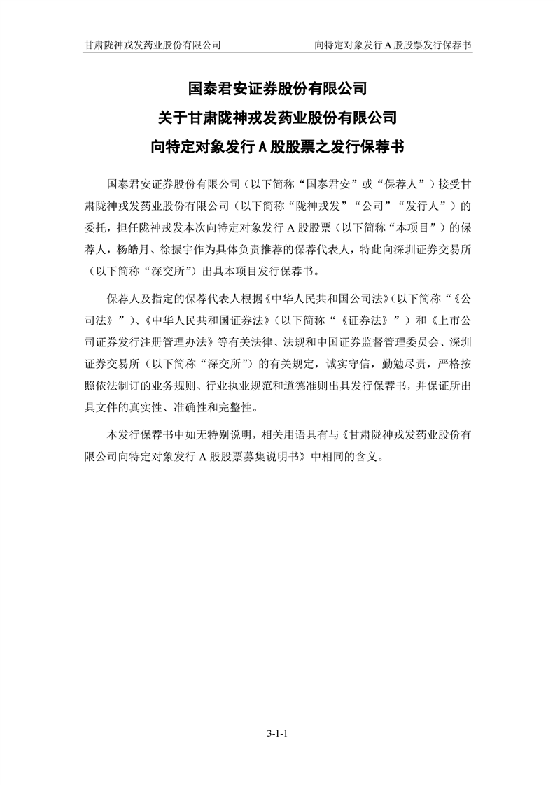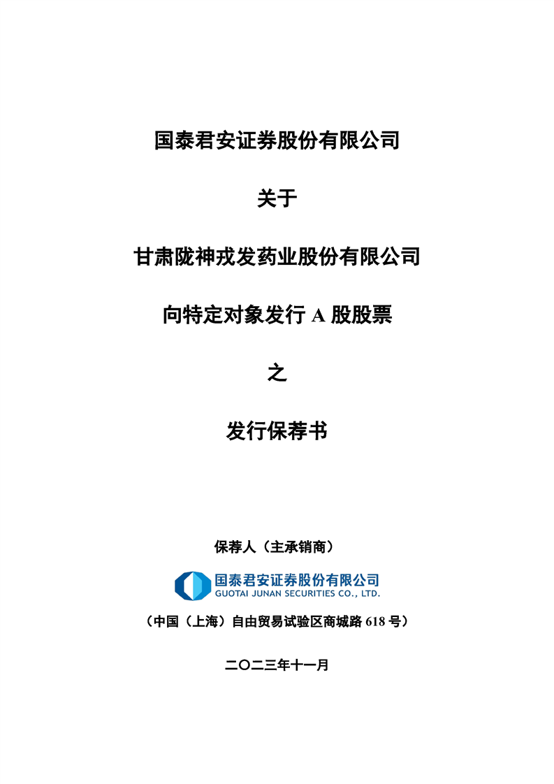 国泰君安证券股份有限公司关于甘肃陇神戎发药业股份有限公司向特定对象发行A股股票之发行保荐书