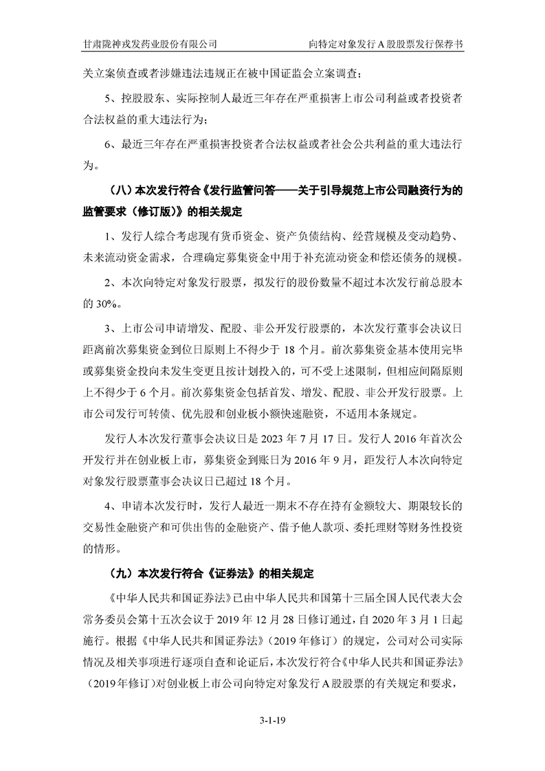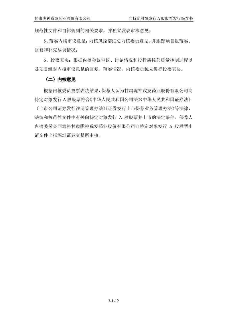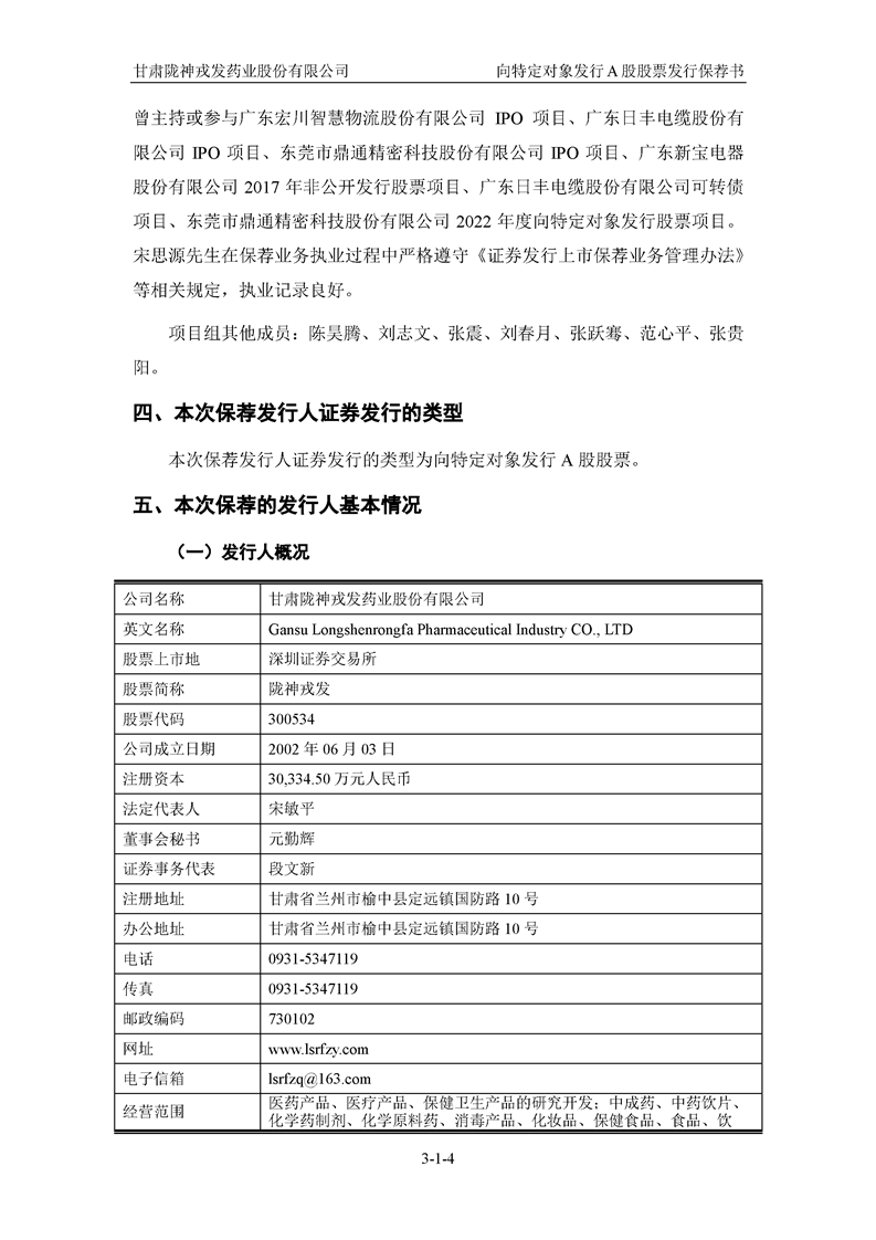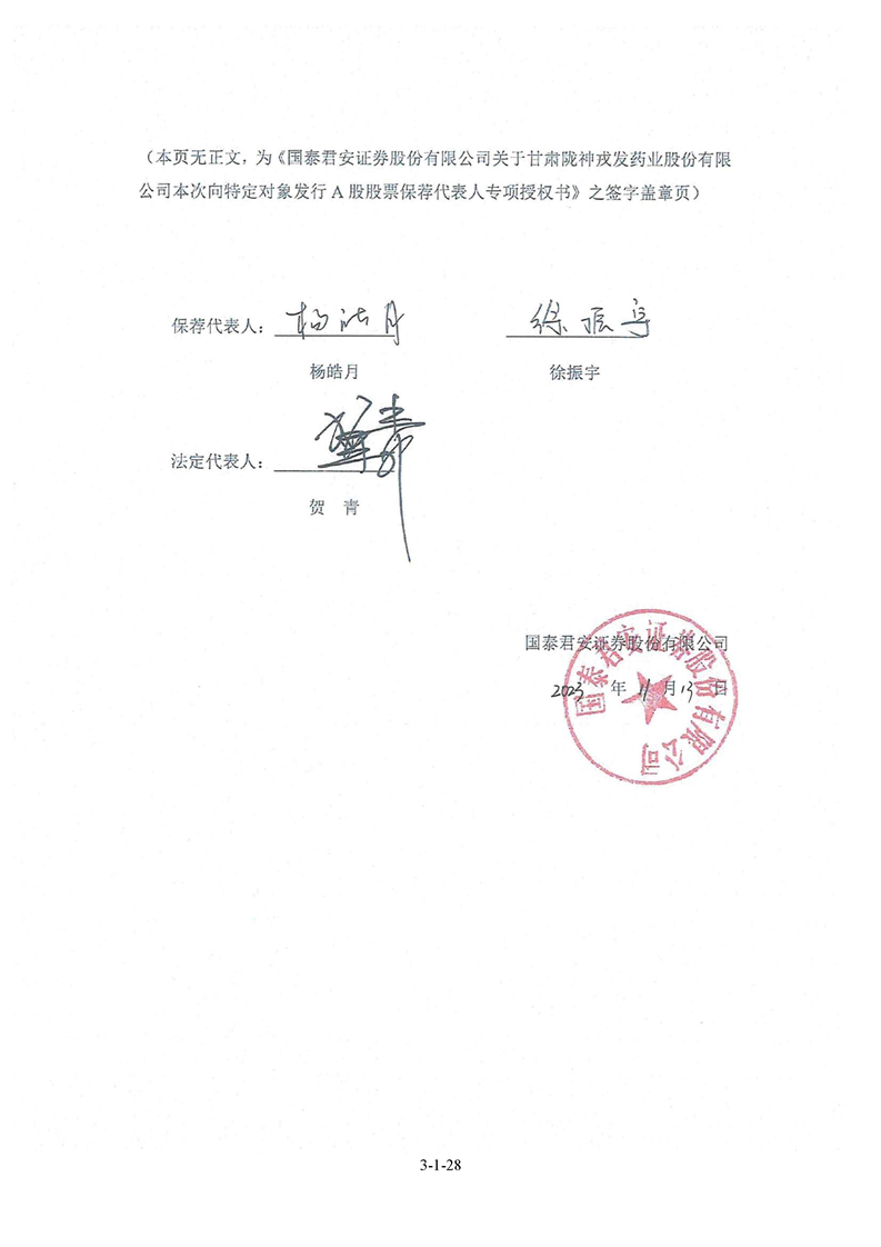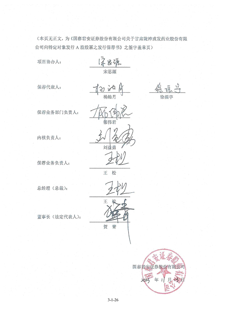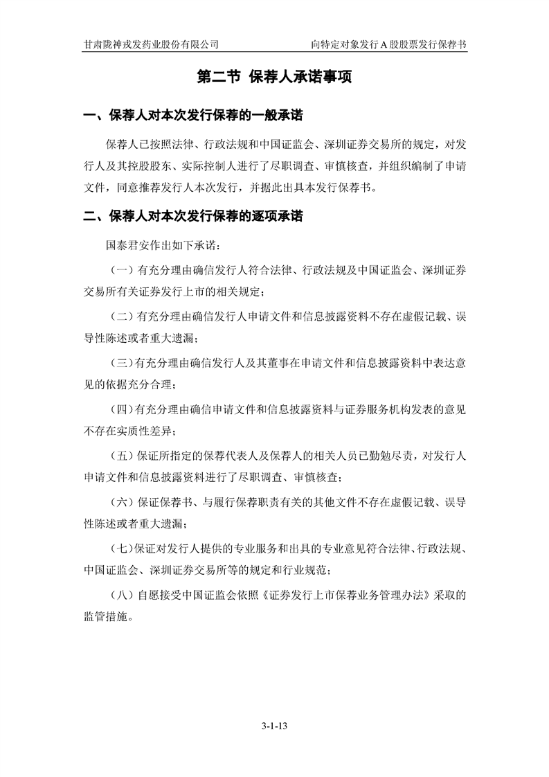 国泰君安证券股份有限公司关于甘肃陇神戎发药业股份有限公司向特定对象发行A股股票之发行保荐书