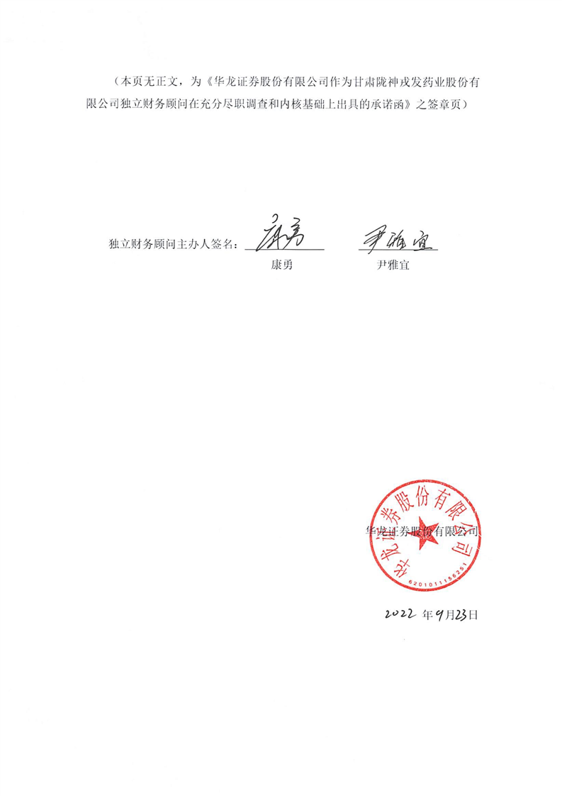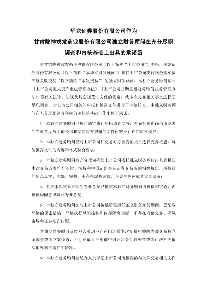 华龙证券股份有限公司作为甘肃陇神戎发药业股份有限公司独立财务顾问在充分尽职调查和内核基础上出具的承诺函