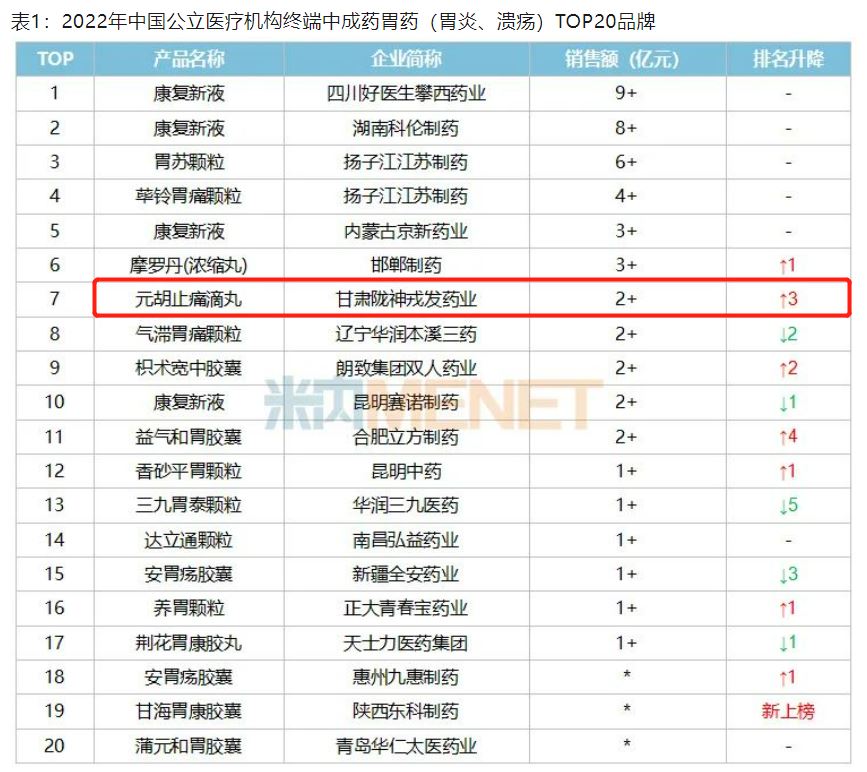 据统计,我国胃肠疾病患者有1.2亿人,且发病率越来越高。据米内网最新数据显示,2022年中国公立医疗机构终端中成药胃药(胃炎、溃疡)销售额保持在70亿元水平。其中甘肃陇神戎发药业的元胡止痛滴丸销售额超过2亿元,在2022年中国公立医疗机构终端中成药胃药(胃炎、溃疡)TOP品牌排名第七。