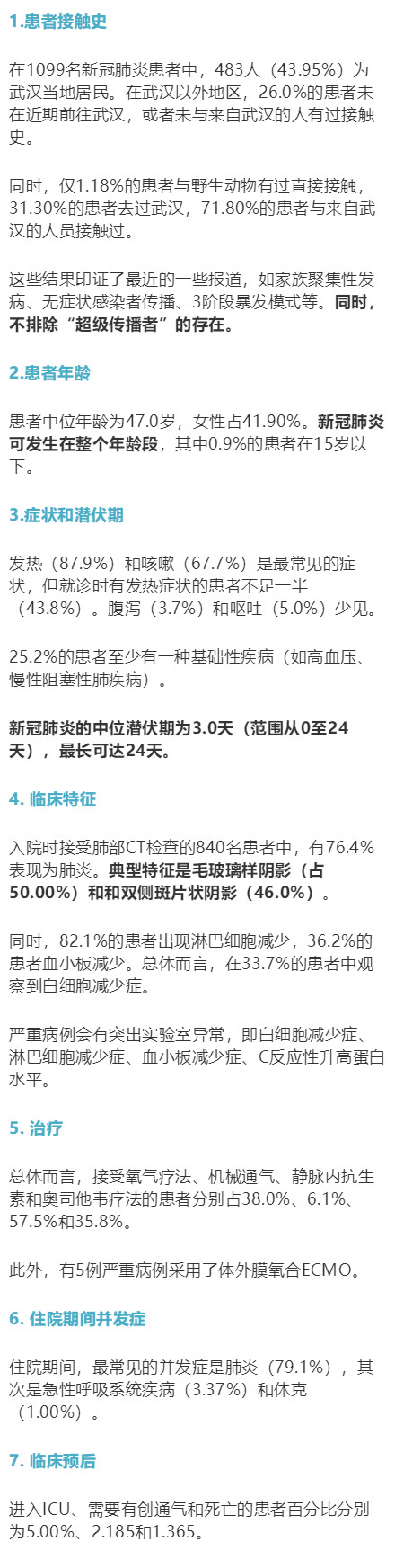 钟南山等人对1099例(截至1月29日)新冠肺炎确诊患者的临床特征进行了回顾性研究。