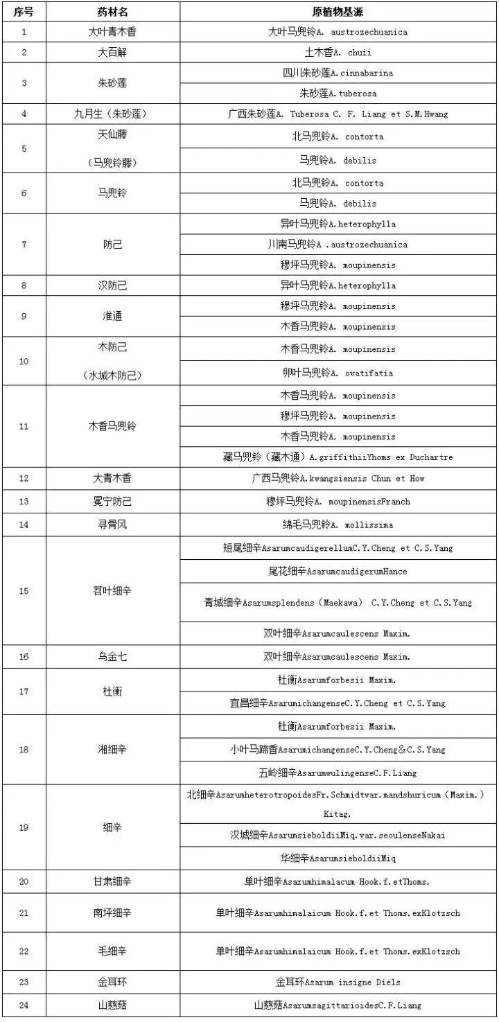 4.目录中的防己、山慈菇均指地方习用药材。防己科防己、兰科山慈菇的药材标准已被2015年版中国药典收载,常用的防己、山慈菇不含马兜铃酸。
