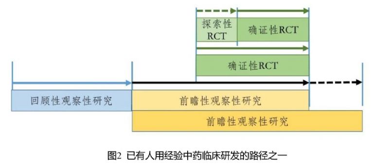 é对è§å¯æ§ç ç©¶ä¸RCTæPCTç ç©¶ç¸ç»åçç åçç¥ï¼å ¶å®ç°ä¹å¯ä»¥æå¤ç§è·¯å¾ï¼å¾2åå¾3æ¯å¯è½è·¯å¾ä¸ç两ç§ï¼ä½ä¸éäºæ¤ãå¾2æ¯è§å¯æ§ç ç©¶ä¸RCTç ç©¶ç¸ç»åçè·¯å¾ï¼ç¬¬ä¸é¶æ®µå å¼å±å顾æ§è§å¯æ§ç ç©¶ï¼æ¤é¶æ®µåºå°½å¯è½å°æ¶éæ¢å¾ä¸ä½¿ç¨è¯¥è¯åæå ³ççå®ä¸çæ°æ®ï¼å æ¬ææå¯è½çååéï¼å¶å®æ°æ®æ¸ çè§åï¼éæ©å¯è½çå¯¹ç §ï¼å¯¹æ°æ®è´¨éè¿è¡è¯ä¼°ï¼éç¨æ°å½çç»è®¡æ¹æ³è¿è¡å ¨é¢è¯¦ç»çåæã妿éè¿å顾æ§è§å¯æ§ç ç©¶å¾åºè¯¥è¯åå¨ä¸´åºåºç¨ä¸å¯¹æ£è å ·ææ½å¨è·çï¼å¯ä»¥è¿å ¥ä¸ä¸ç ç©¶é¶æ®µï¼å¦åç ç©¶ç»æ¢ã第äºé¶æ®µå¼å±åç»æ§è§å¯æ§ç ç©¶ãç±äºæäºç¬¬ä¸é¶æ®µçç ç©¶åºç¡ï¼è¯¥é¶æ®µå¯ä»¥å°åç»æ§è§å¯æ§ç ç©¶è®¾è®¡å¾æ´å å¨å¯ï¼å æ¬æ°æ®çééåå ¶ç³»ç»ãæ°æ®çè´¨éæ§å¶ãæ°æ®æ¸ ççè§åãæç¡®å®ä¹å¯¹ç §çãå¨åç»æ§è§å¯æ§ç ç©¶è¿å±å°æä¸æ¶æï¼å¦ææ°æ®åæç»æä¸å顾æ§è§å¯æ§ç ç©¶ç»æä¸è´ï¼ä¸ç»§ç»æ¾ç°åºè¯¥è¯åå¨ä¸´åºåºç¨ä¸å¯¹æ£è å ·æææ¾è·çï¼å¯éæ¶å¹³è¡å¼å±ç¬¬ä¸é¶æ®µçRCTç ç©¶ãRCTç ç©¶å¯ä»¥å è¿è¡æ¢ç´¢æ§RCTç ç©¶ï¼ä½å¦æåæçè§å¯æ§ç ç©¶è¯æ®è¾å åï¼ä¹å¯ä»¥ç´æ¥è¿è¡ç¡®è¯æ§RCTç ç©¶ã仿¶é´ä¸çï¼RCTç ç©¶ç卿å¯è¢«åç»æ§è§å¯æ§ç ç©¶æè¦çï¼åè å¯ä»¥å¨RCTç ç©¶å¼å§åç»æï¼ä¹å¯ä¸RCTç ç©¶åæ¶ç»æï¼çè³å¨RCTç ç©¶ç»æåç»§ç»å»¶å±ä¸æ®µæ¶é´ï¼ä»¥ç§¯ç´¯æ´å åççå®ä¸çè¯æ®ï¼æç¨äºå ¶ä»ç®çï¼å¦å¢å éåºçææ©å¤§éç¨äººç¾¤èå´çã